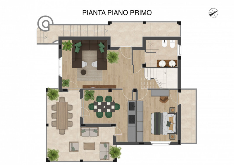 Si sviluppa su due livelli, al primo piano si trovano un ampio e luminoso soggiorno, una cucina abitabile, una camera da letto, un servizio, un comodo ripostiglio ed un ampio terrazzo di 28 mq.