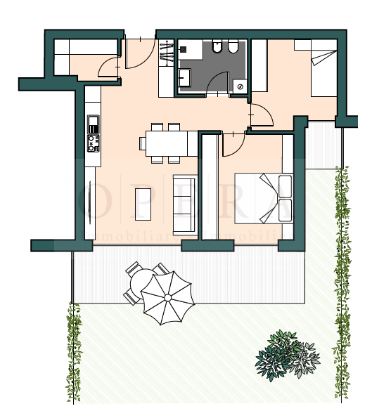 Composizione: Due stanze letto, zona giorno composta da soggiorno con angolo cottura, ripostiglio, terrazza, giardino privato in posizione interna e soleggiata, cantina al piano interrato, possibilità garage.