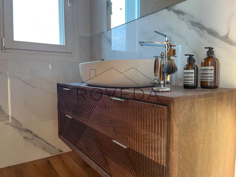 Le ampie aperture che sfogano su un terrazzo abitabile di 32,19 mq., valorizzano la luce naturale e mettono continuità tra l’interno e l’esterno.Tramite il disimpegno si raggiunge la zona notte dove trovano posto la camera matrimoniale di 16 mq., la camera singola e il secondo bagno finestrato con doccia.