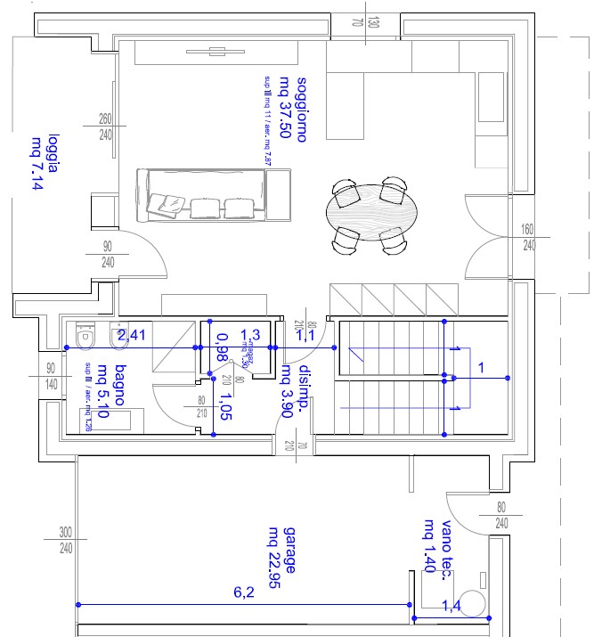 Piano terra: ampia zona giorno open space, bagno di servizio e garage con accesso diretto all’abitazione;