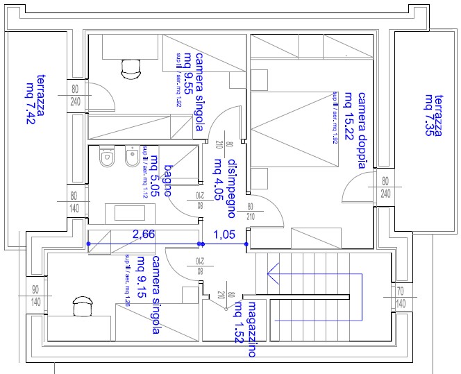 Piano primo: tre camere da letto, secondo bagno finestrato.